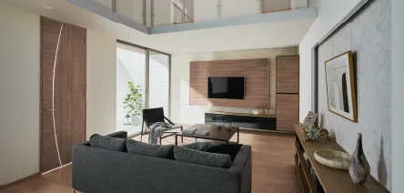 味わいのある木質素材をベースに、コンクリートやメタルなど異素材をプラスしたインテリア。