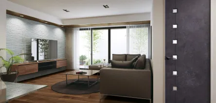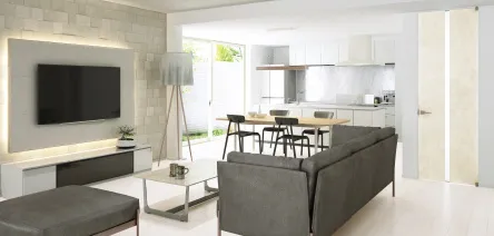 シンプルな空間を、温かみのある木目や石目の素材でナチュラルに仕上げたインテリア。