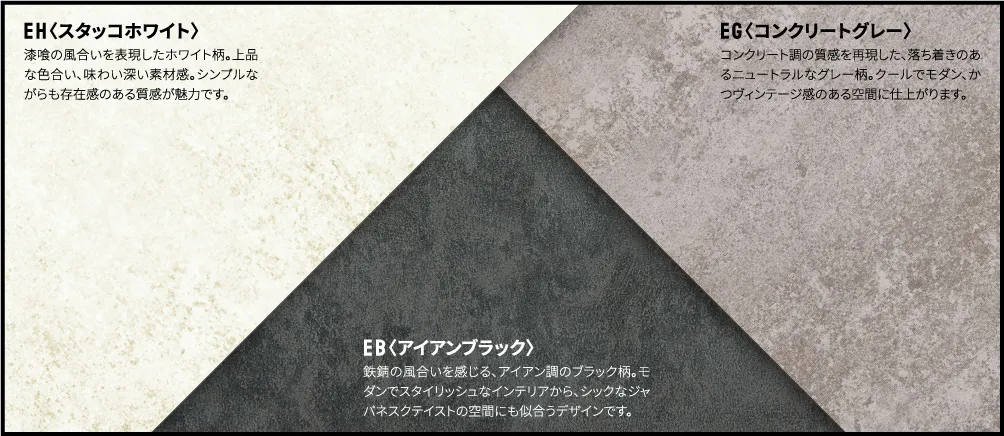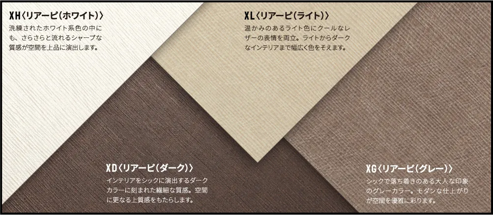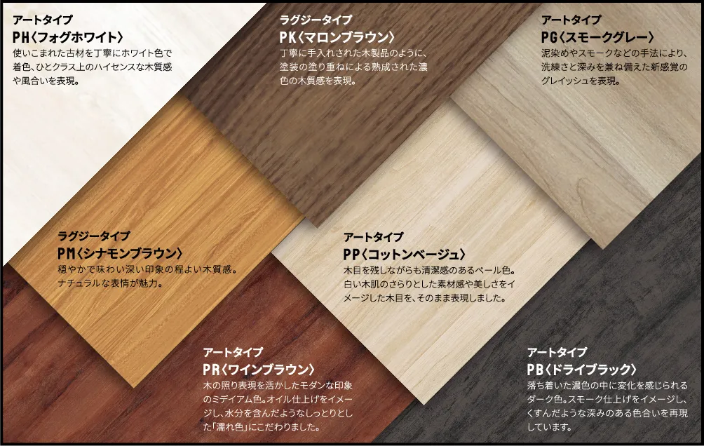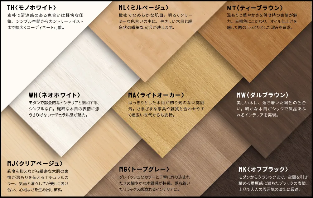 ハピアはベースとなる9カラーを中心に、新しさを感じられる「トレンドウッド調」・空間表現の幅を広げる「ソリッド調」・繊細な陰影を感じられる「レザー調」・光沢感のある「グロス調」の4つのデザインで、個性豊かなインテリアを実現します。ここでは、各デザインのカラーをご紹介します。