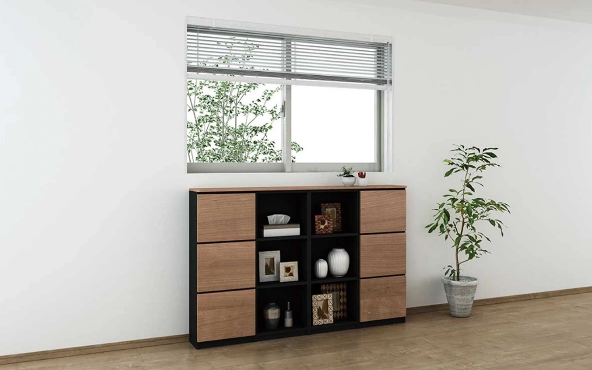 窓下やリビングのちょっとしたスペースに壁面収納を設置すれば、収納量スペースを増やせるため、おすすめです。奥行が浅い収納なら、ちょっとしたモノを収納できます。オープン棚をつくることでディスプレイスペースにもなるため、お好きなインテリア小物や写真立てなどを飾って部屋の雰囲気づくりにも貢献するでしょう。