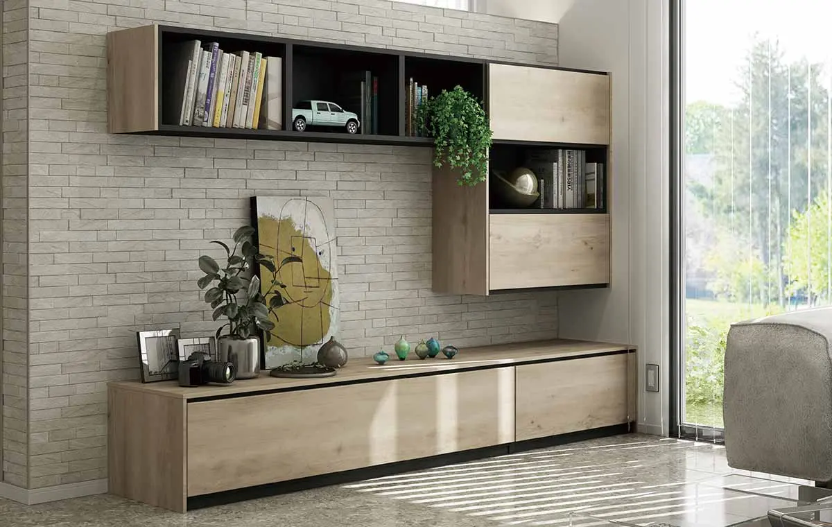 外見のコンパクトさに反して収納力抜群の薄型キャビネットプラン。窓下や廊下などの狭小スペースにもフィットするのが嬉しいところ。扉付きとオープンを半々に合わせることでディスプレイと収納が両立できます。ミニマリストにもおすすめのキャビネットです。