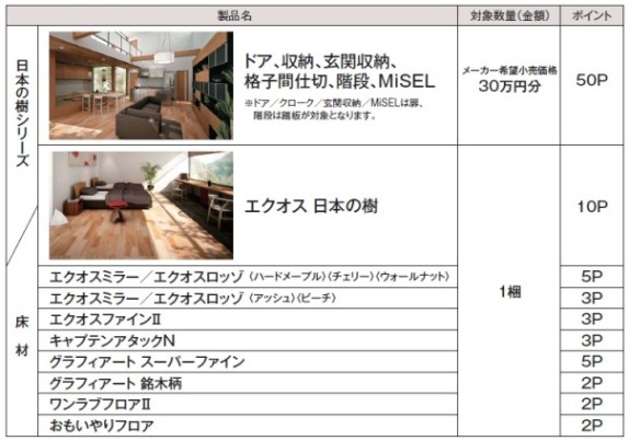 久居工場からお届けする床材をはじめとした対象製品の出荷ポイントに応じ、久居工場の所在地、三重県の特産品である「松阪ハム」や「伊勢うどん」など、美味しい「選べるギフト」をご用意しております(先着3000口)。皆様のご応募をお待ちしております。