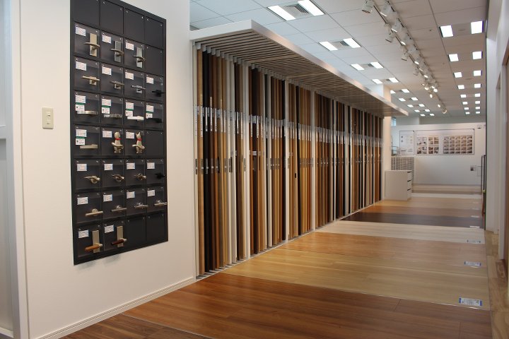 以前の新宿ショールームにもあった、「床」「壁」「ドア」「収納」の色柄選定コーナーの機能はそのままに、レイアウト等の工夫により更に使いやすく、ご検討しやすい展示設計としました。また、今回新しくセミオーダーメイドでご提案するシステム収納『MiSEL(ミセル)』の独立コーナーを新設。扉の開閉型式や扉・ボックスの色柄などが確認でき、仕様決めにご活用いただけます。