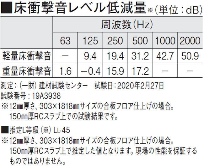 (※2 12mm厚さ、303×1,818mmサイズの合板フロア仕上げの場合。150mm厚RCスラブ上で推定した値となります。現場の性能を保証するものではありません。)
