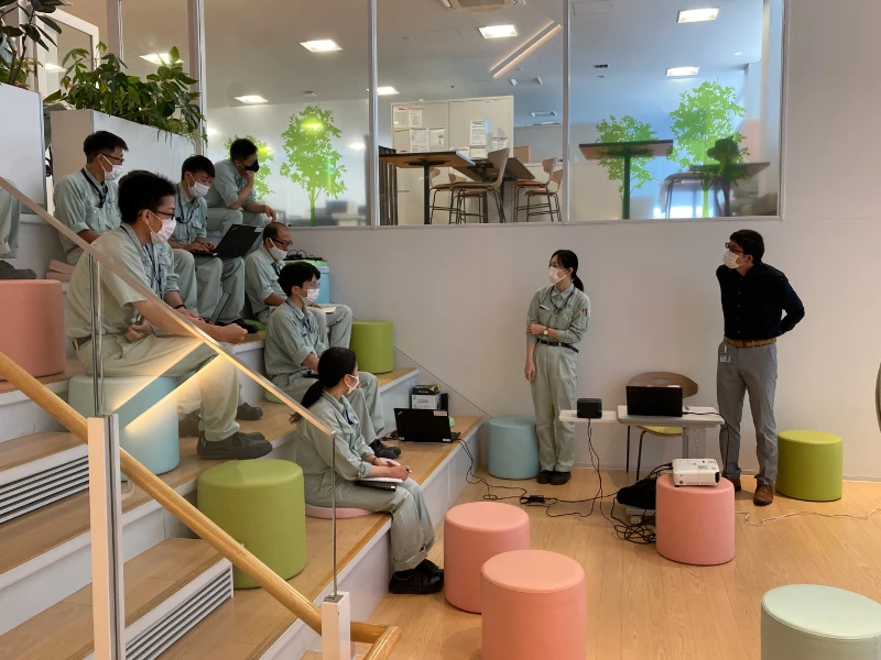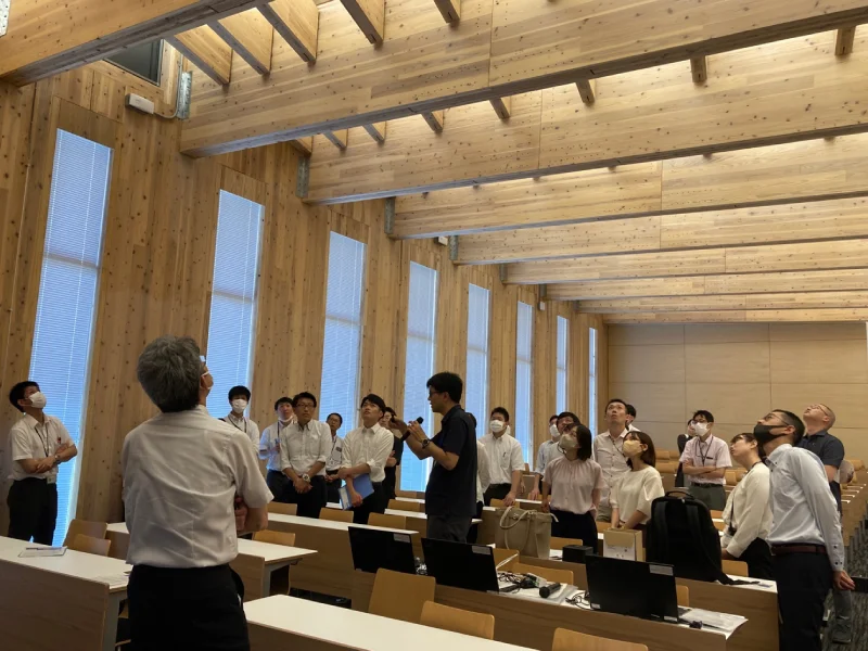 2022年に岡山大学環境生命学域2年生を対象に工場見学を実施したほか、2023年8月には社内イベントとして岡山大学のCLT(直交集成板)建築物である「岡山大学共育共創コモンズ」(OUX)の見学会を開催しました。あわせて、新入社員の研究発表会を当施設で開催しています。