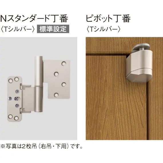 (2)丁番\nNスタンダード丁番を標準設定。※写真は2枚吊 (右吊・下用)です。よりシンプルでスッキリした外観となるピボット丁番の他、スリム枠専用のスリム枠丁番もお選びいただけます。