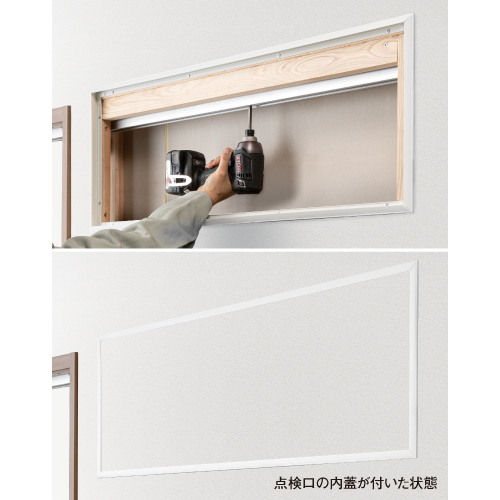 | キャプション | 引込戸のメンテナンス性を向上。 吊戸引込用戸袋点検口(オプション) 引込戸の戸袋内のメンテナンス用の点検口です。点検時の内蓋の取り外しが簡単で、レールの修理や交換もスムーズに行えます。点検口を開けて控壁内部の吊戸レールを直接確認できるので、修理やメンテナンスに対応しやすくなります。 ※片引(引込タイプ)/引分(引込タイプ) |