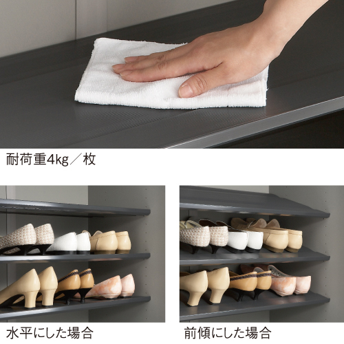 棚板\n毎日のお手入れも簡単です\n拭くだけで、簡単に汚れが落とせます。\n樹脂製なので水洗いも可能です。\n設置角度をアレンジできます。\nオーソドックスな水平と、出し入れのしやすい前傾の2種類に対応。どちらもダボの位置を付け変えるだけで、簡単に変更できます。\n※耐荷重とは、棚板へのひび・割れなど破壊することがない状態を保つ重量を示したもので、棚板にたわみのない状態を保つ重量を示したものではありません。