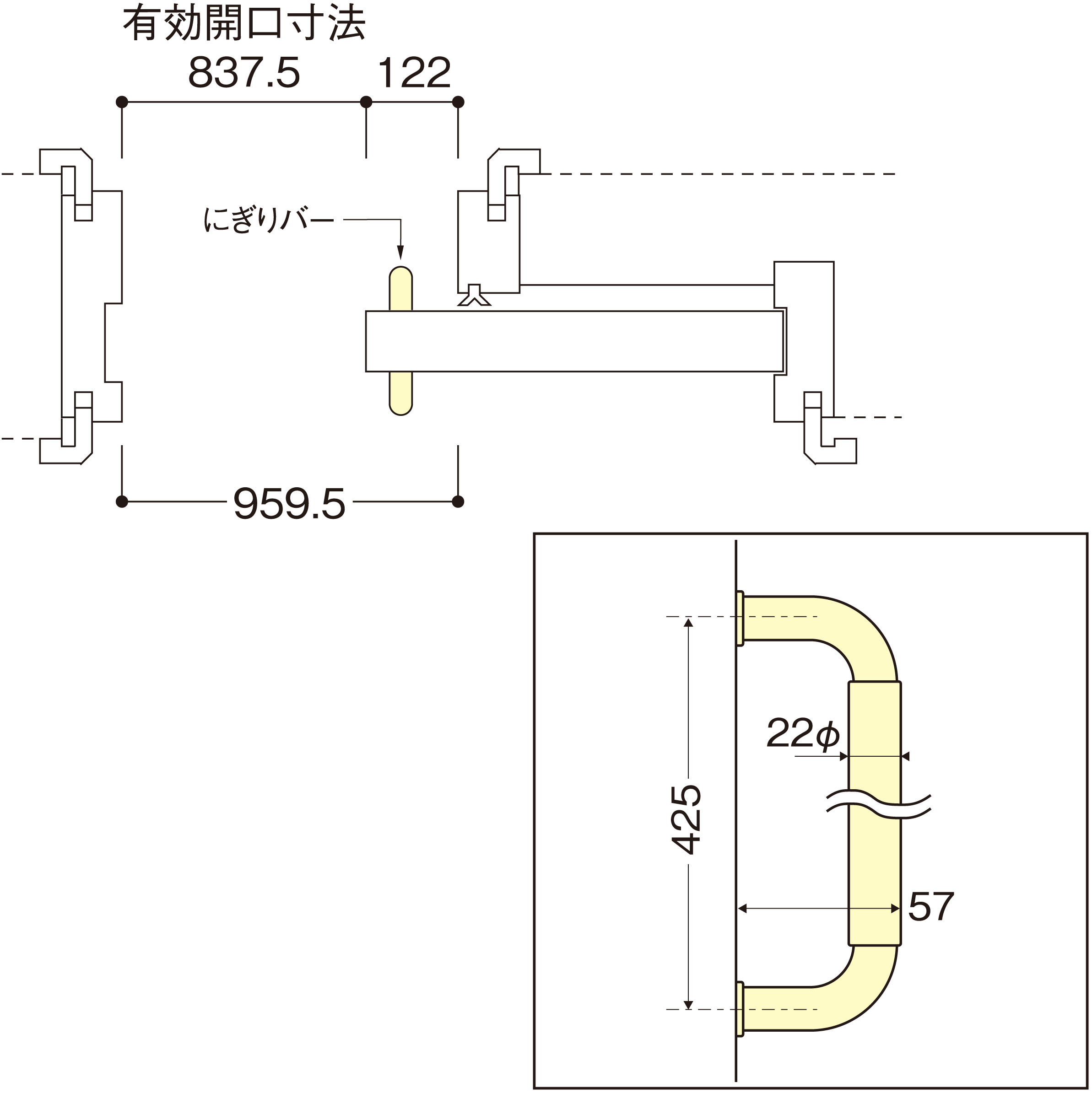 巾広引戸・巾広吊戸には高齢の方でも使いやすいように、にぎりバーを採用しています。\n開けた時、122mmの引残しをとって、にぎりバーをひきやすいように設計しています。\n(ご注意)他の引戸・吊戸は芯材がないため、にぎりバーは取り付けできません。