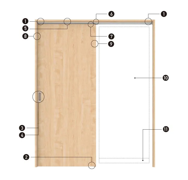 ■吊戸基本仕様\n写真は〈ミルベージュ〉です。\n(1)両側『ラクラクローズ』\n(2)床付ガイドピン/床付下ガイドレール\n(3)空錠引手\n(4)カマ錠\n(5)上吊レール\n(6)扉同士のすき間防止\n(7)吊車\n(8)戸先木口\n(9)ソフトクッション ※3枚引違のセンター扉のみ\n(10)控壁下地ユニット(オプション)\n(11)控壁用巾木(オプション)