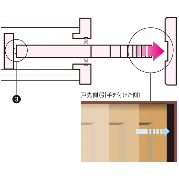(2)『ラクラクローズ』\n(戸先側のみ)\n扉をゆっくりと引き込みます。\n吊戸を閉める直前にゆっくり扉を引き込むため枠にぶつかっての跳ね返りを防ぎます。確実に閉まるので開けっ放しも防げます。