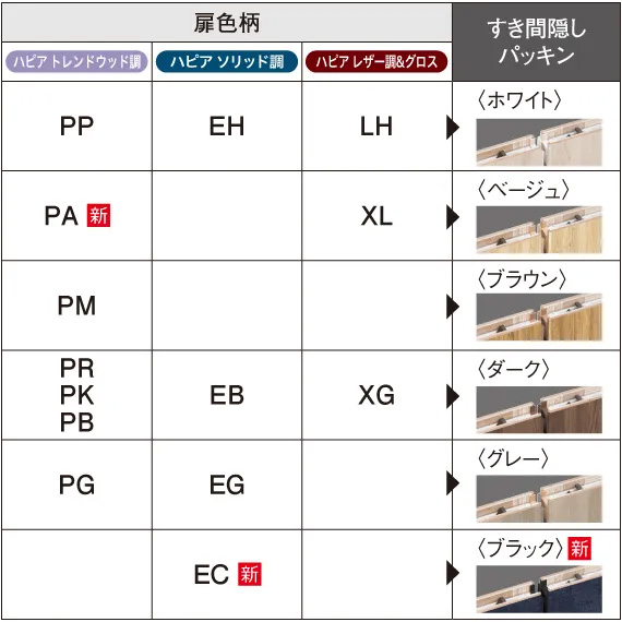 「ずっと ここちいいね」を実現する企業 DAIKEN 建材製品情報 画像 データ検索 jpg G_D_hapia_hikido_trend_line_011.jpg すき間隠しパッキンの色柄について\n※ 扉色柄によりすき間隠しパッキンの色が異なります。 ファイル種類 特長写真 見出し キャプション すき間隠しパッキンの色柄について※ 扉色柄によりすき間隠しパッキンの色が異なります。