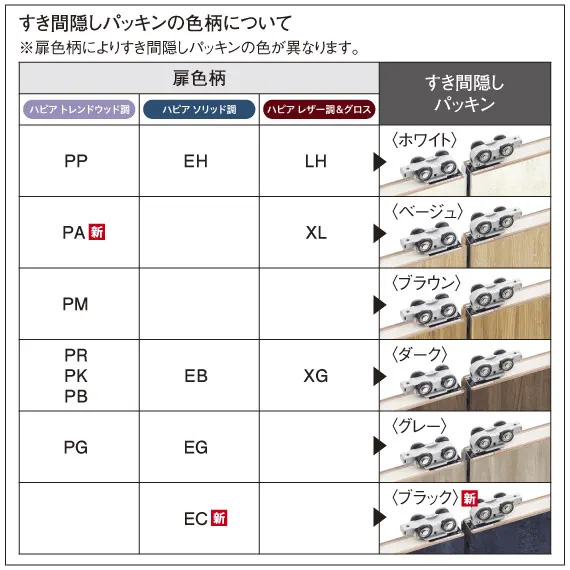 「ずっと ここちいいね」を実現する企業 DAIKEN 建材製品情報 画像 データ検索 jpg G_D_hapia_trend_door_tsurido_line_004-2.jpg すき間隠しパッキンの色柄について\n※ 扉色柄によりすき間隠しパッキンの色が異なります。 ファイル種類 特長写真 見出し キャプション すき間隠しパッキンの色柄について※ 扉色柄によりすき間隠しパッキンの色が異なります。