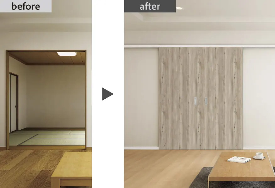 | キャプション | アウトセット吊戸・引分 開口部につけられた無目枠をそのままに引分を上貼り施工。1階の客間を間仕切ることで家族のプライベート空間に簡単リモデル。 |
