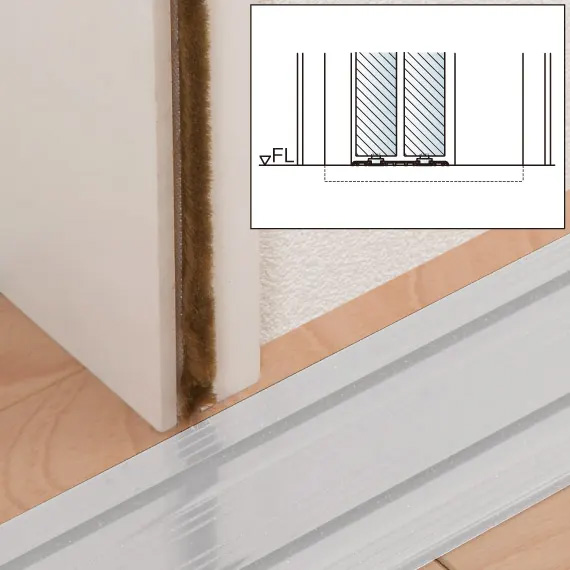 (3枚引違・2枚片引・3枚片引)\n床付下レール\n扉の振れ止めに効果的な3mm厚の床付下レール。\n・レールは床に直置きして固定するだけの簡単施工\n・ 床の色に合わせて〈ブロンズ〉〈シルバー〉からお選びいただけます。\n写真は2枚片引用です。\n