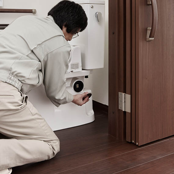| キャプション | メンテナンスがカンタン 誤ってオムツを入れても大丈夫 扉がフルオープンできるので、側面に掃除口の付いたトイレなら、認知症の場合に心配されるオムツなどのトイレ詰まりも簡単に取り出せます。 |
