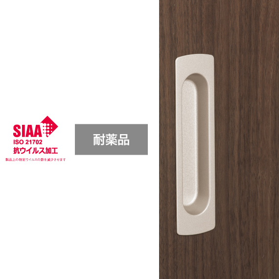 手に触れる場所には抗ウイルス加工を\n引手\n抗ウイルス塗料をコーティングし、空気中や手から、製品の表面に付着した特定ウイルスの数を減少させます。