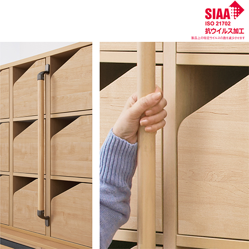 | キャプション | ●ディンプル手摺セット(オプション) 手摺セットを取付すれば靴の脱ぎ履きやベンチの立ち座りのサポートになります。高齢者の方がにぎりやすい太さになっています(φ32㎜)。 ※中仕切板に取付可能です。また、手摺木製部分には抗ウイルス塗料をコーティングしています。 |