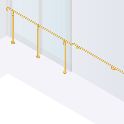 | キャプション | ブラケット横用・フレキシブルジョイントを使えば、壁のある場所への連続設置が可能です。 壁のある場所への連続設置 ● 床付け手摺への連続設置 |