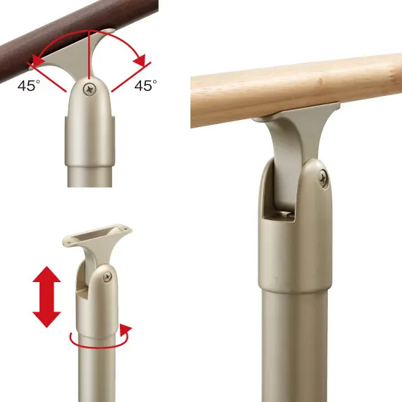 | キャプション | 床付け手摺用支柱 首角度が調節でき、上部を回転させて高さも微調整できます。 平手摺の取付けも可能です。 高さの調整可能寸法は20mmです。 支柱はカットできません。 |