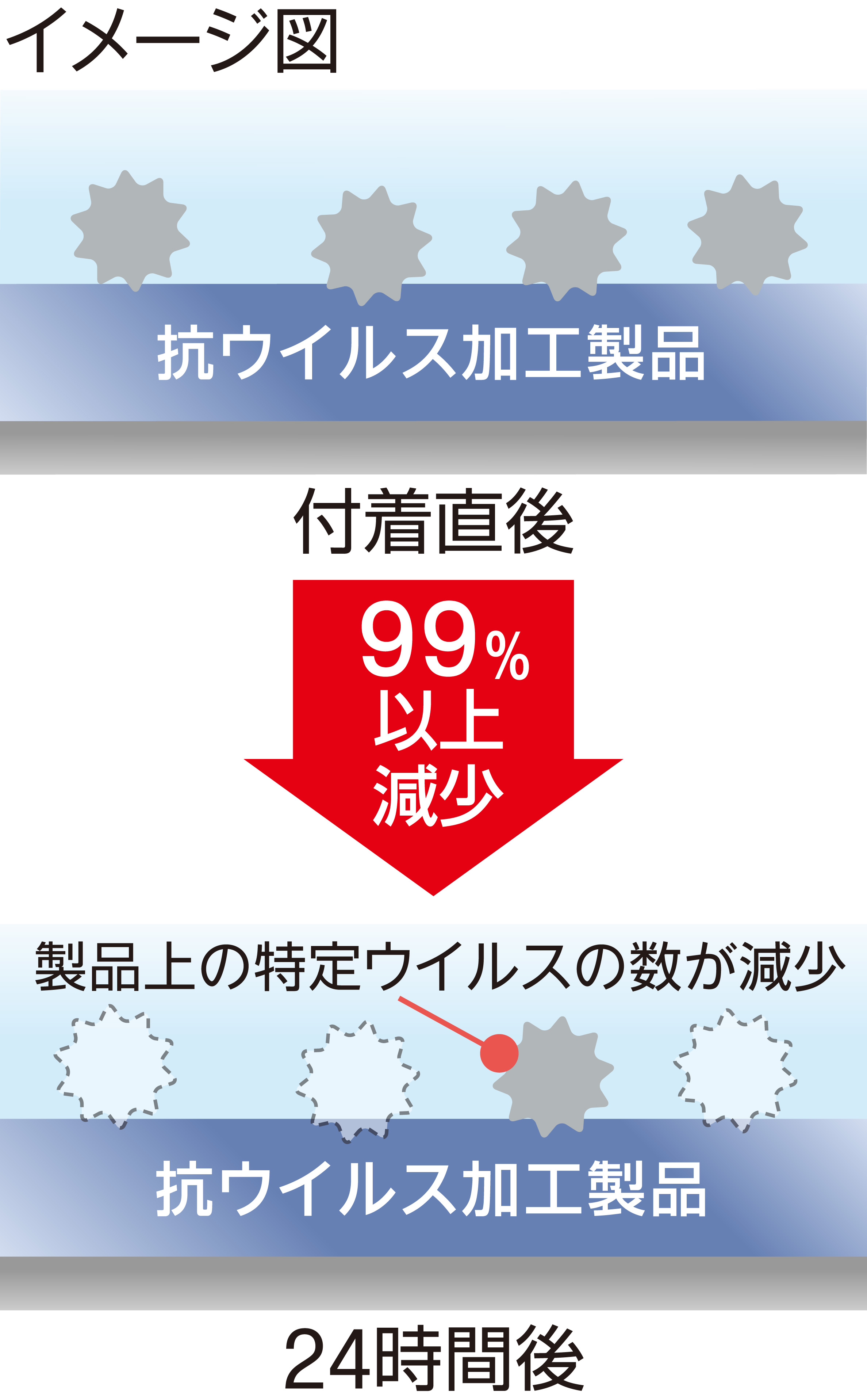 | キャプション | ※抗ウイルス加工は、病気の治療や予防を目的とするものではありません。 ※上記数値は試験結果であり、性能を保証するものではありません。 |
