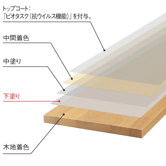 | キャプション | 水がかり配慮仕様について 下塗り工程が追加され、標準仕様よりも硬度が高く、水分が浸み込みにくい表面仕様となります。トップコートは標準仕様と共通なので、抗ウイルス加工も施しています。※全面塗装となります。 |
