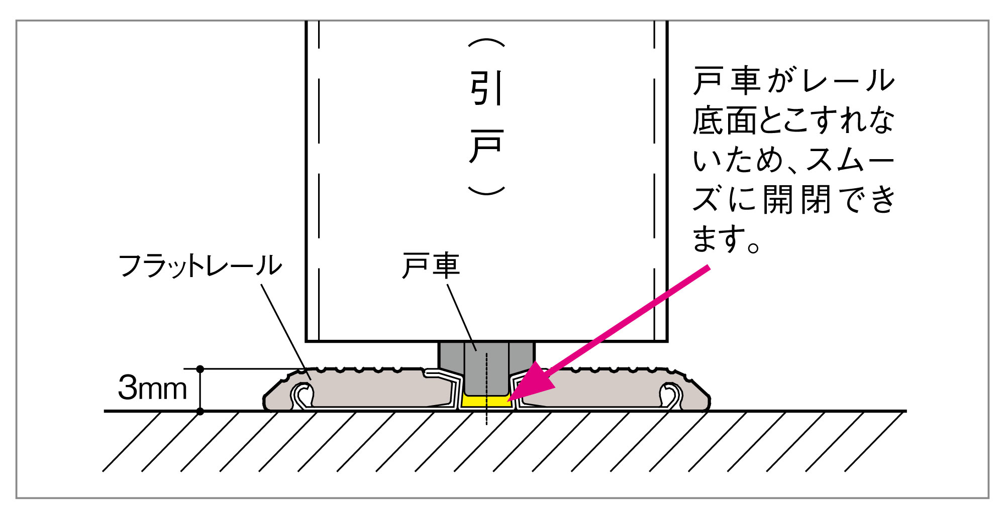 | キャプション | 床に直付けする簡単施工のバリアフリータイプ。段差3㎜でありながら戸車がレール底面をこすらず、スムーズに開閉できるレールです。 |