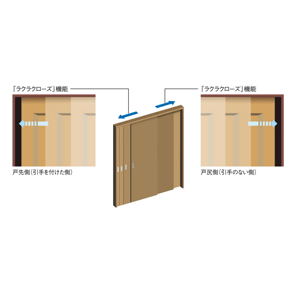 (2)両側『ラクラクローズ』(標準装備)\n扉が枠にぶつかって跳ね返ることを防ぎます。引戸を閉める直前にゆっくりと扉を引き込み、きっちりと扉を閉めるので、開けっぱなしになることを防ぎます。戸先側と戸尻側に装備しているので、扉を開けるときと閉めるときの両方に作動します。\n※扉のデザインやサイズ、重量、使用環境によって、扉の引き込み方は異なります。また、作動時に音が鳴ることがありますが、異常ではありません。