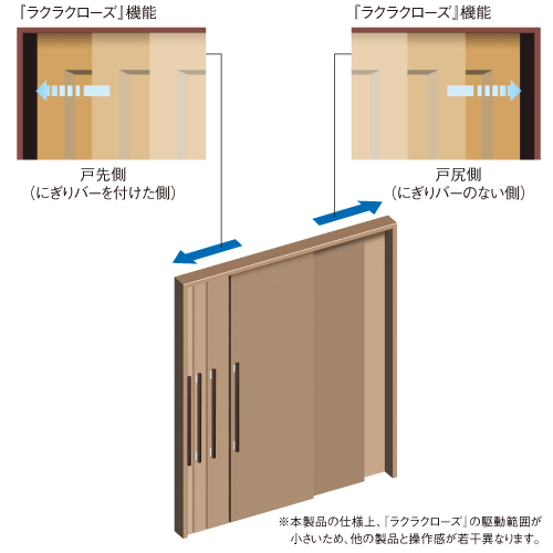 両側『ラクラクローズ』機能(標準装備)\n扉が枠にぶつかって跳ね返ることを防ぎます。\n吊戸を閉める直前にゆっくりと扉を引き込み、きっちりと扉を閉めるので、開けっぱなしになることを防ぎます。戸先側と戸尻側に装備しているので、扉を開けるときと閉めるときの両方に作動します。\n※本製品の仕様上、『ラクラクローズ』の駆動範囲が小さいため、他の製品と操作感が若干異なります。\n※扉のデザインやサイズ、重量、使用環境によって、扉の引き込み方は異なります。また、作動時に音が鳴ることがありますが、異常ではありません。