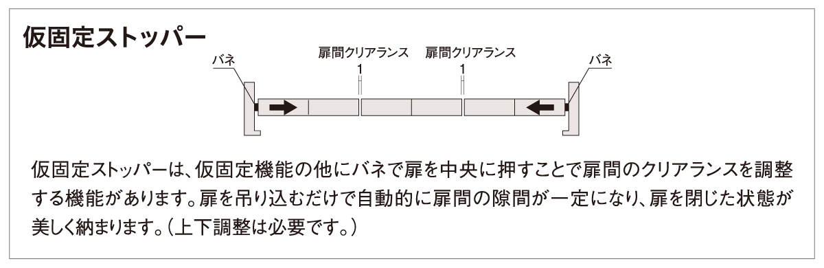 フリー・ピボット兼用(上吊式)\n仮固定ストッパー\n仮固定ストッパーは、仮固定機能の他にバネで扉を中央に押すことで扉間のクリアランスを調整する機能があります。扉を吊り込むだけで自動的に扉間の隙間が一定になり、扉を閉じた状態が美しく納まります。(上下調整は必要です。)
