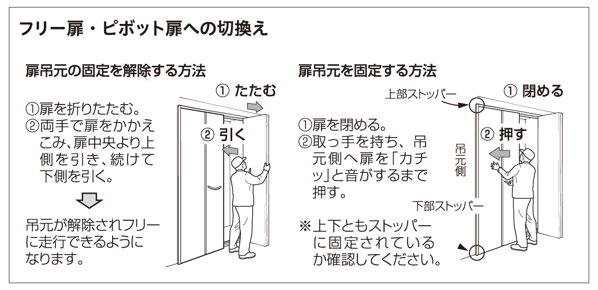 | キャプション | フリー・ピボット兼用(上吊式) フリー扉・ピボット扉への切換え |
