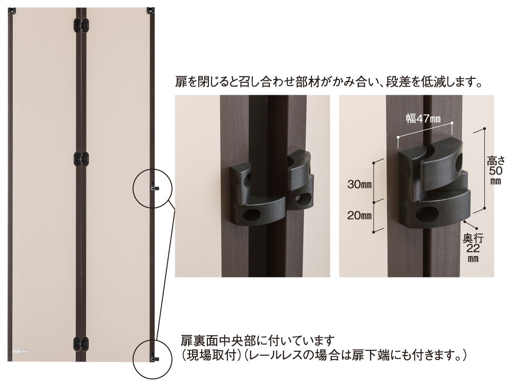 | キャプション | 扉裏面の召し合わせ部材 召し合わせ部材 閉めたときクローク扉の段差を低減する召し合わせ部材です。 |