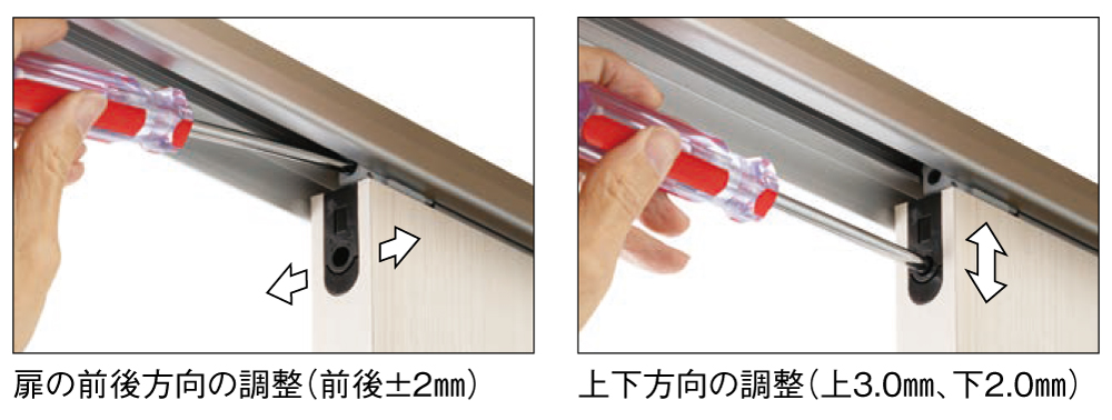 「ずっと ここちいいね」を実現する企業 DAIKEN 建材製品情報 画像 データ検索 jpg G_D_hapia_design_door_tsurido_sekoujouhou2.jpg (A)吊車の調整\n吊車を調整して、扉と枠の隙間を調整します。 ファイル種類 コラム画像3カラム 見出し キャプション (A)吊車の調整吊車を調整して、扉と枠の隙間を調整します。