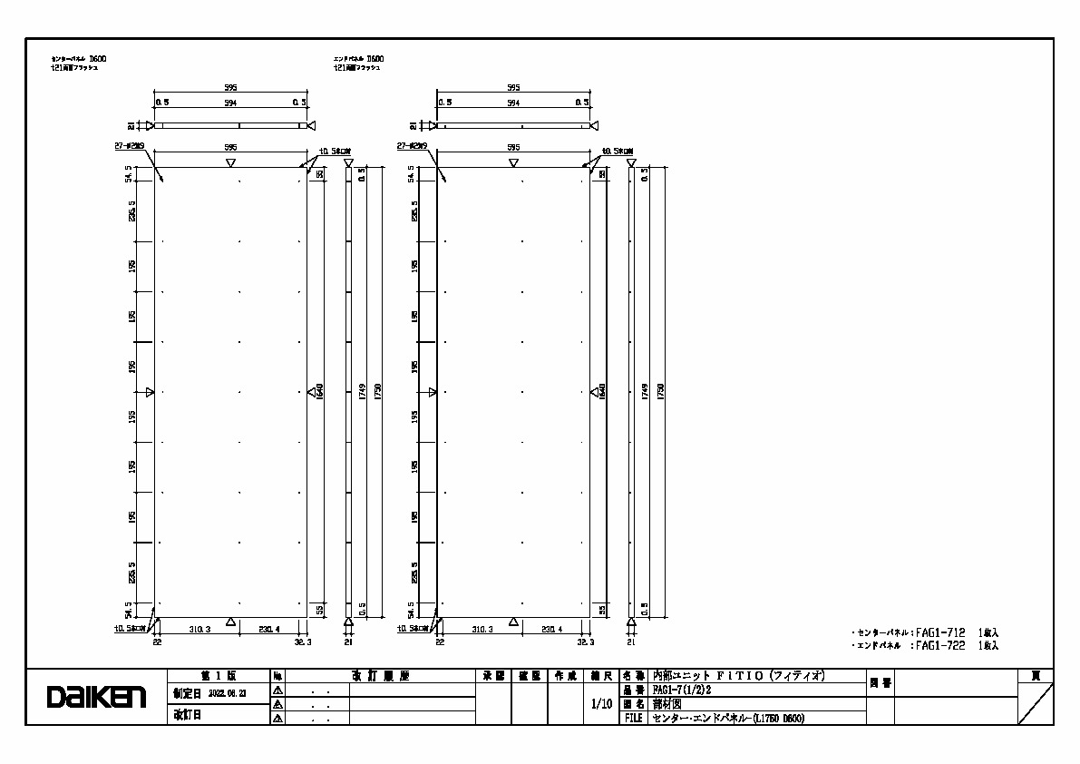 センター・エンドパネル (L1750 D600) 三面図