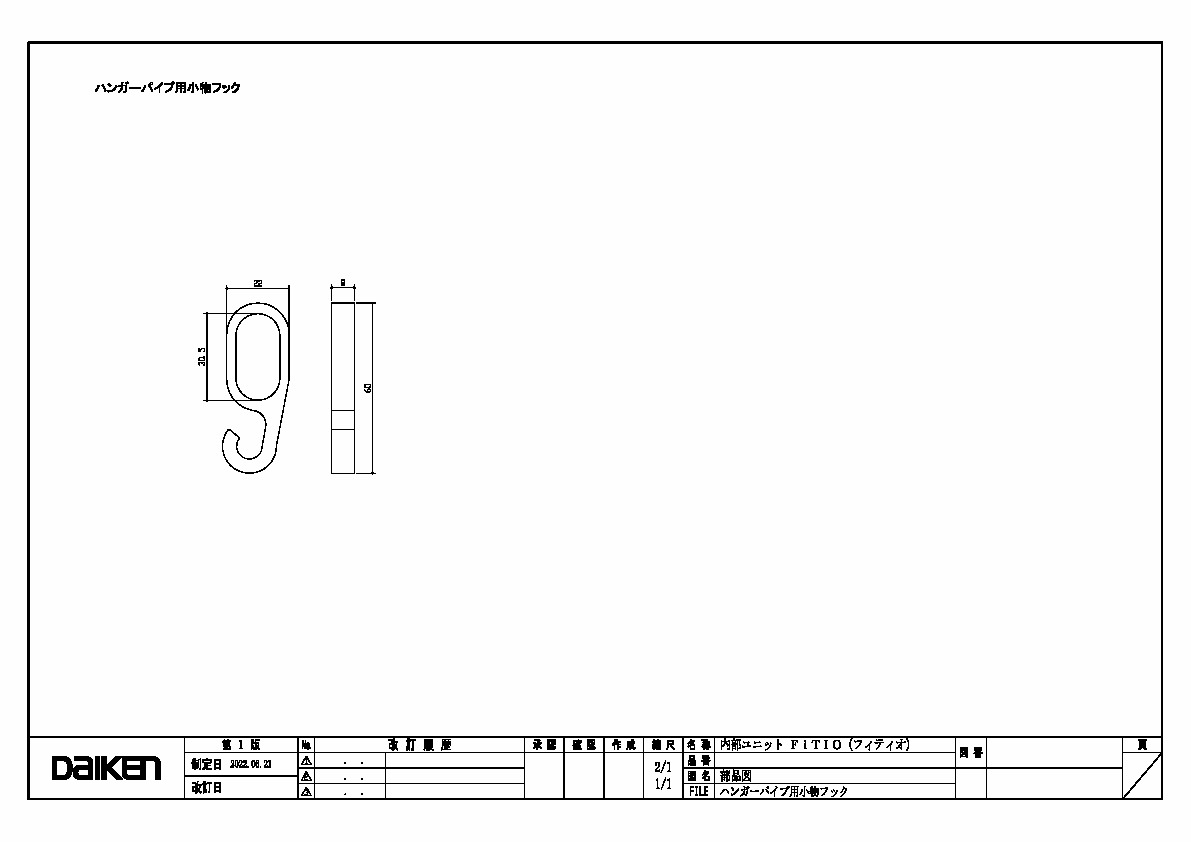 「ずっと ここちいいね」を実現する企業 DAIKEN 建材製品情報 図面 データ検索 pdf Z_D_2022-FITIO-HangerpipeBracketHook-1.pdf webp Z_D_2022-FITIO-HangerpipeBracketHook-1.webp 製品図 ハンガーパイプ用小物フック 三面図 データ分類_第1分類 図面 データ分類_第2分類 収納 データ分類_第3分類 内部ユニット データ分類_第4分類 FiTIO(フィティオ) 側面棚柱タイプ データ分類_第5分類 オプション ファイル種類 製品図 見出し 製品図 キャプション ハンガーパイプ用小物フック 三面図 改定日 2022/06/21 備考