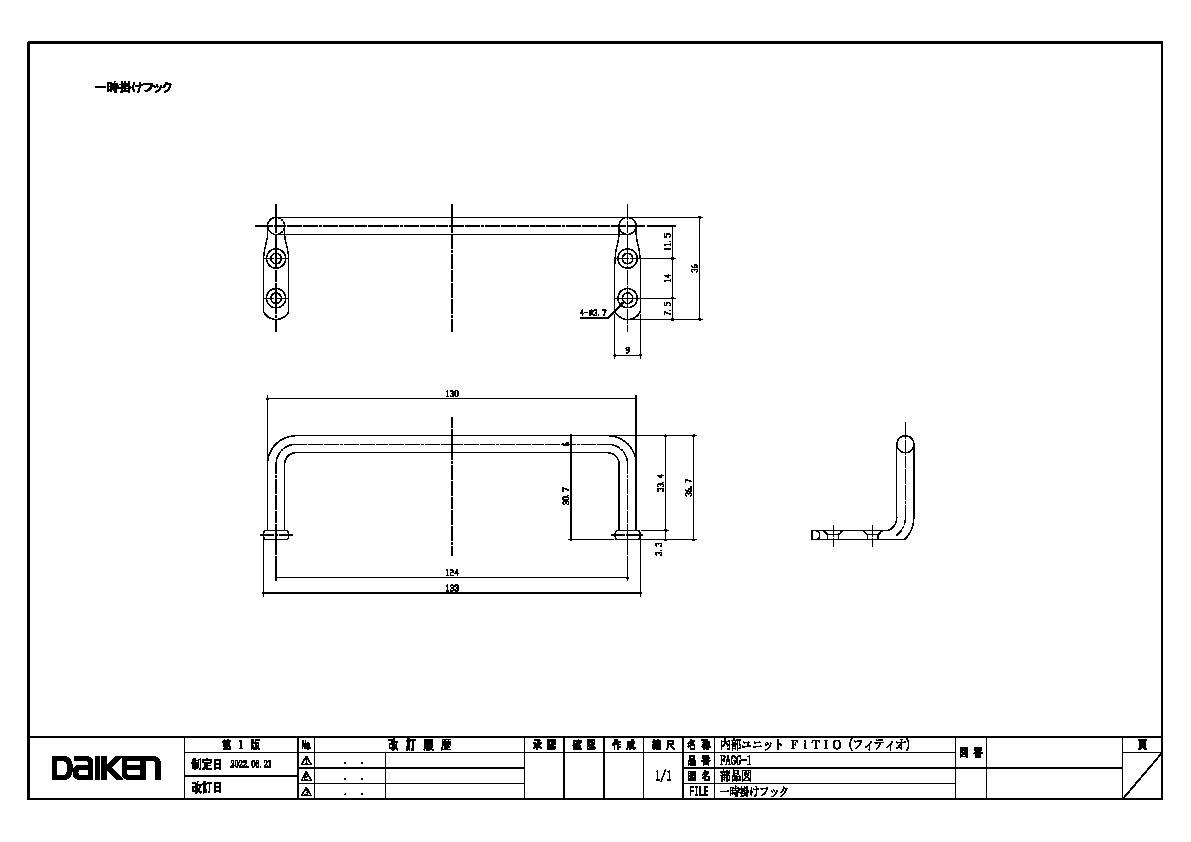 「ずっと ここちいいね」を実現する企業 DAIKEN 建材製品情報 図面 データ検索 pdf Z_D_2022-FITIO-ItijikakeHook-1.pdf webp Z_D_2022-FITIO-ItijikakeHook-1.webp 製品図 一時掛けフック 三面図 データ分類_第1分類 図面 データ分類_第2分類 収納 データ分類_第3分類 内部ユニット データ分類_第4分類 FiTIO(フィティオ) 側面棚柱タイプ データ分類_第5分類 オプション ファイル種類 製品図 見出し 製品図 キャプション 一時掛けフック 三面図 改定日 2022/06/21 備考