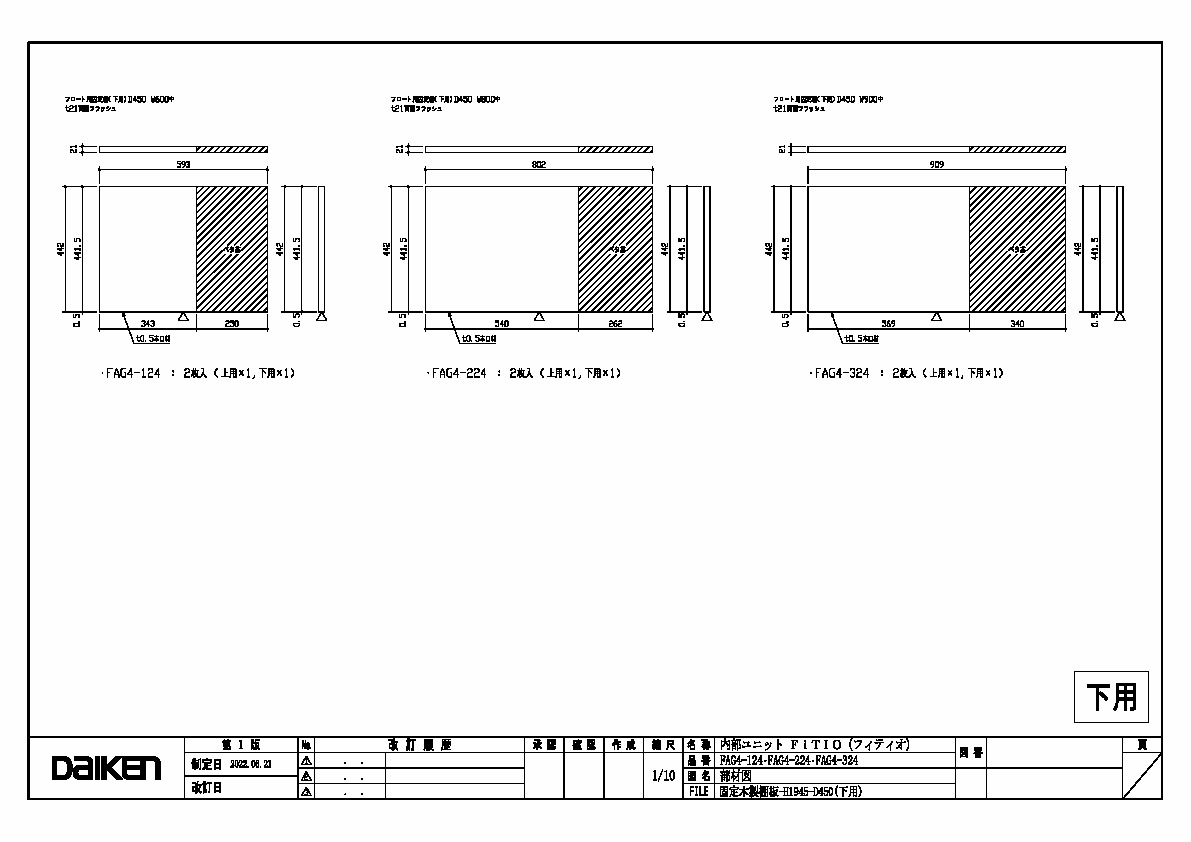 | キャプション | 固定木製棚板 H1945 D450(下用) 三面図 |