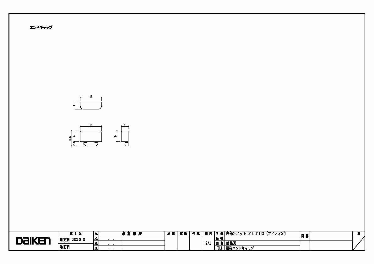 「ずっと ここちいいね」を実現する企業 DAIKEN 建材製品情報 図面 データ検索 pdf Z_D_2022-FITIO-TanaitaEndcap-1.pdf webp Z_D_2022-FITIO-TanaitaEndcap-1.webp 製品図 棚柱エンドキャップ 三面図 データ分類_第1分類 図面 データ分類_第2分類 収納 データ分類_第3分類 内部ユニット データ分類_第4分類 FiTIO(フィティオ) 側面棚柱タイプ データ分類_第5分類 オプション ファイル種類 製品図 見出し 製品図 キャプション 棚柱エンドキャップ 三面図 改定日 2022/06/21 備考