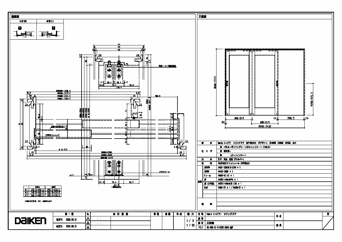キャプション 2432幅 2045高 引手 角座 空錠 フラットレール(2432幅用) 三面図