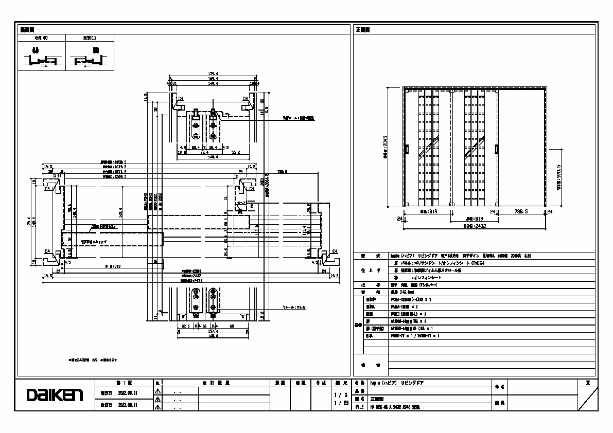 | キャプション | 2432幅 2045高 引手 角座 空錠 敷居(145.4mm) 三面図 |