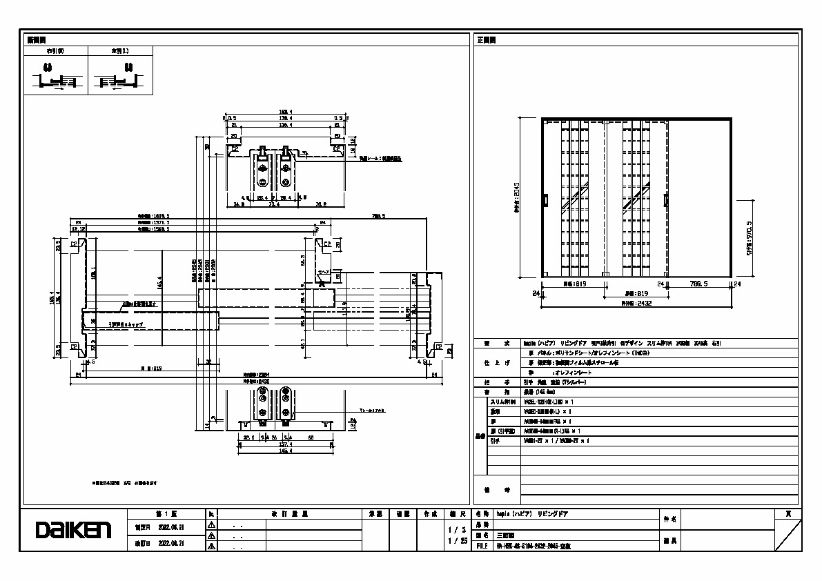 | キャプション | 2432幅 2045高 引手 角座 空錠 敷居(145.4mm) 三面図 |
