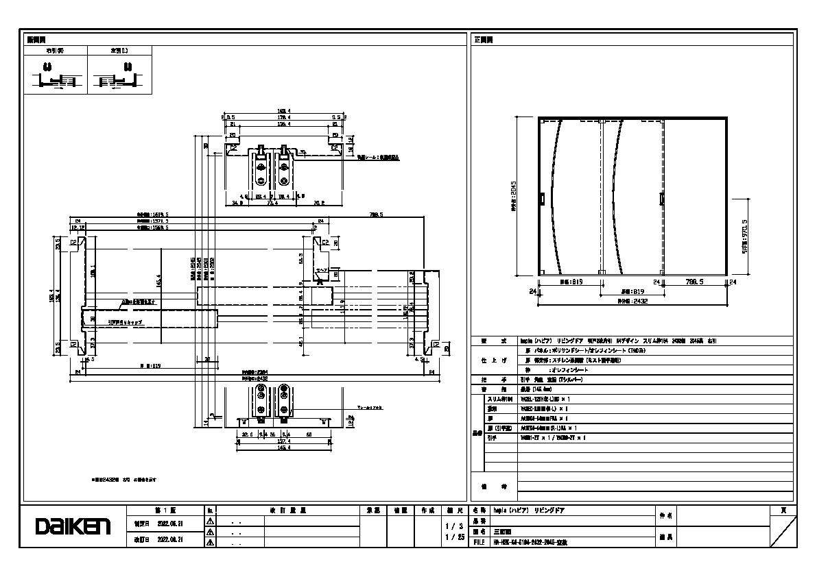 | キャプション | 2432幅 2045高 引手 角座 空錠 敷居(145.4mm) 三面図 |