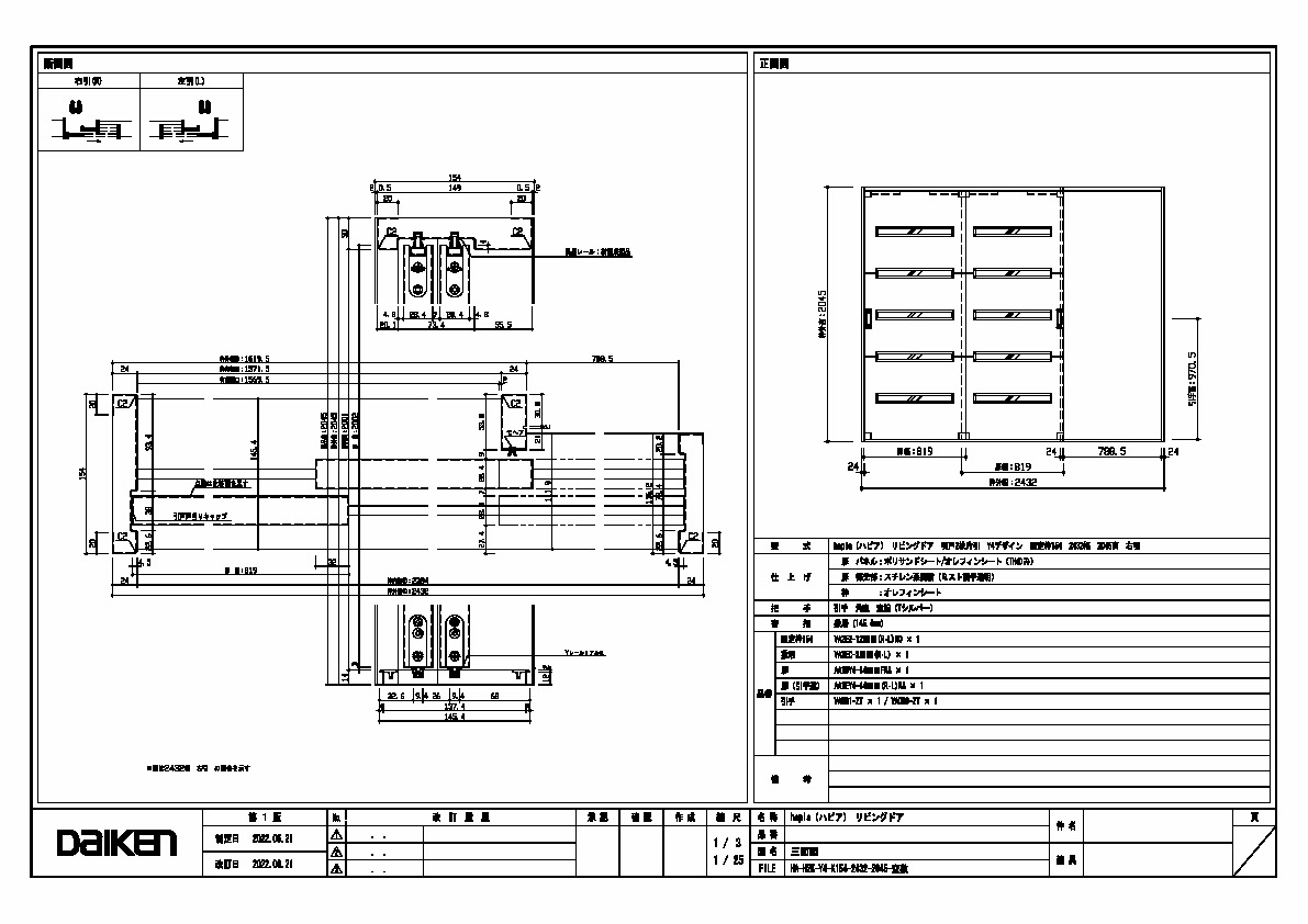| キャプション | 2432幅 2045高 引手 角座 空錠 敷居(145.4mm) 三面図 |