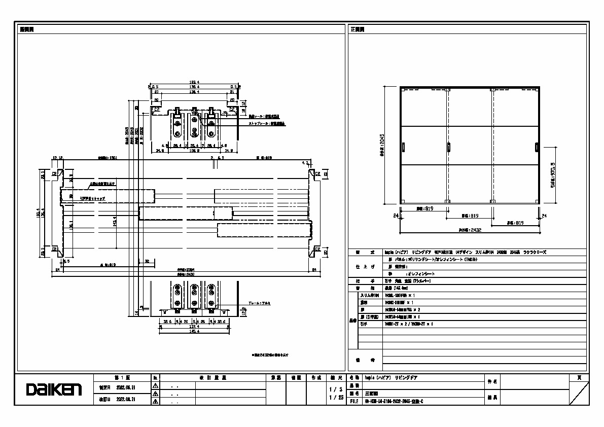 | キャプション | 2432幅 2045高 引手 角座 空錠 敷居(145.4mm) 三面図 |