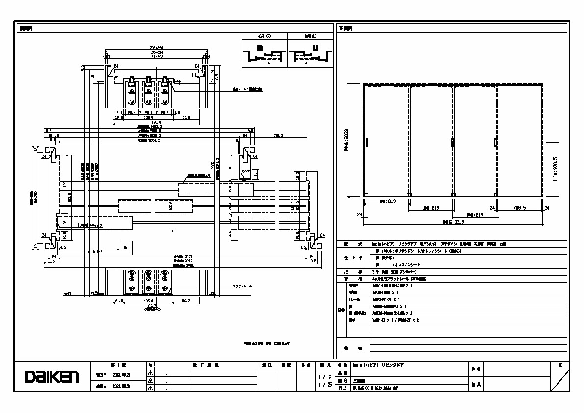 | キャプション | 3219幅 2033高 引手 角座 空錠 フラットレール(3219幅用) 三面図 |