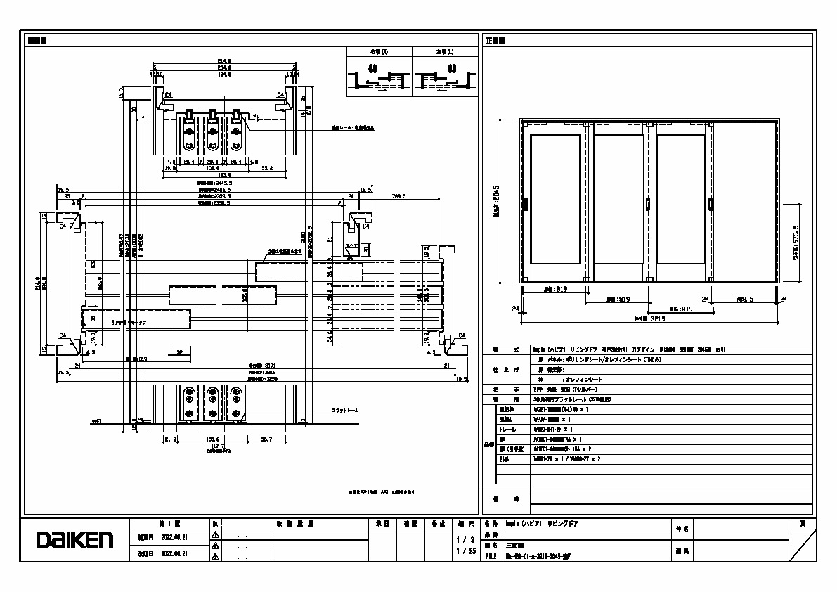 | キャプション | 3219幅 2045高 引手 角座 空錠 フラットレール(3219幅用) 三面図 |