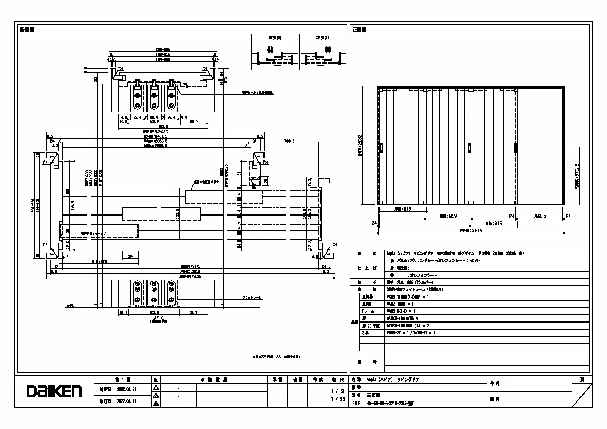 | キャプション | 3219幅 2033高 引手 角座 空錠 フラットレール(3219幅用) 三面図 |