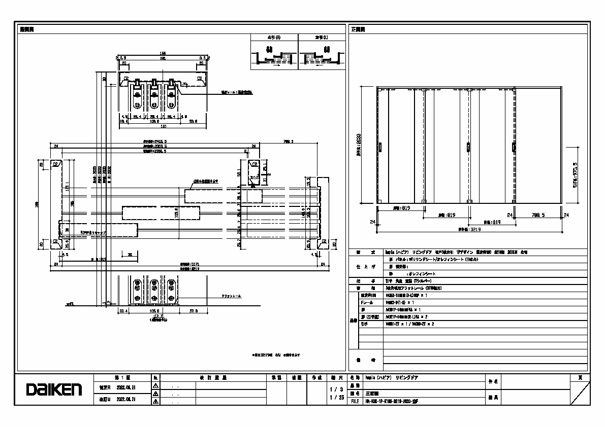 | キャプション | 3219幅 2033高 引手 角座 空錠 フラットレール(3219幅用) 三面図 |