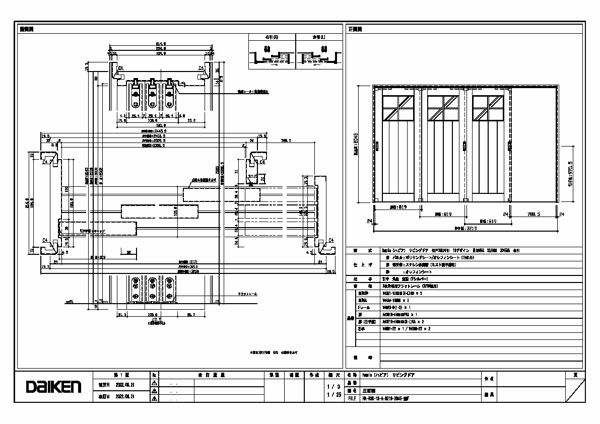 | キャプション | 3219幅 2045高 引手 角座 空錠 フラットレール(3219幅用) 三面図 |