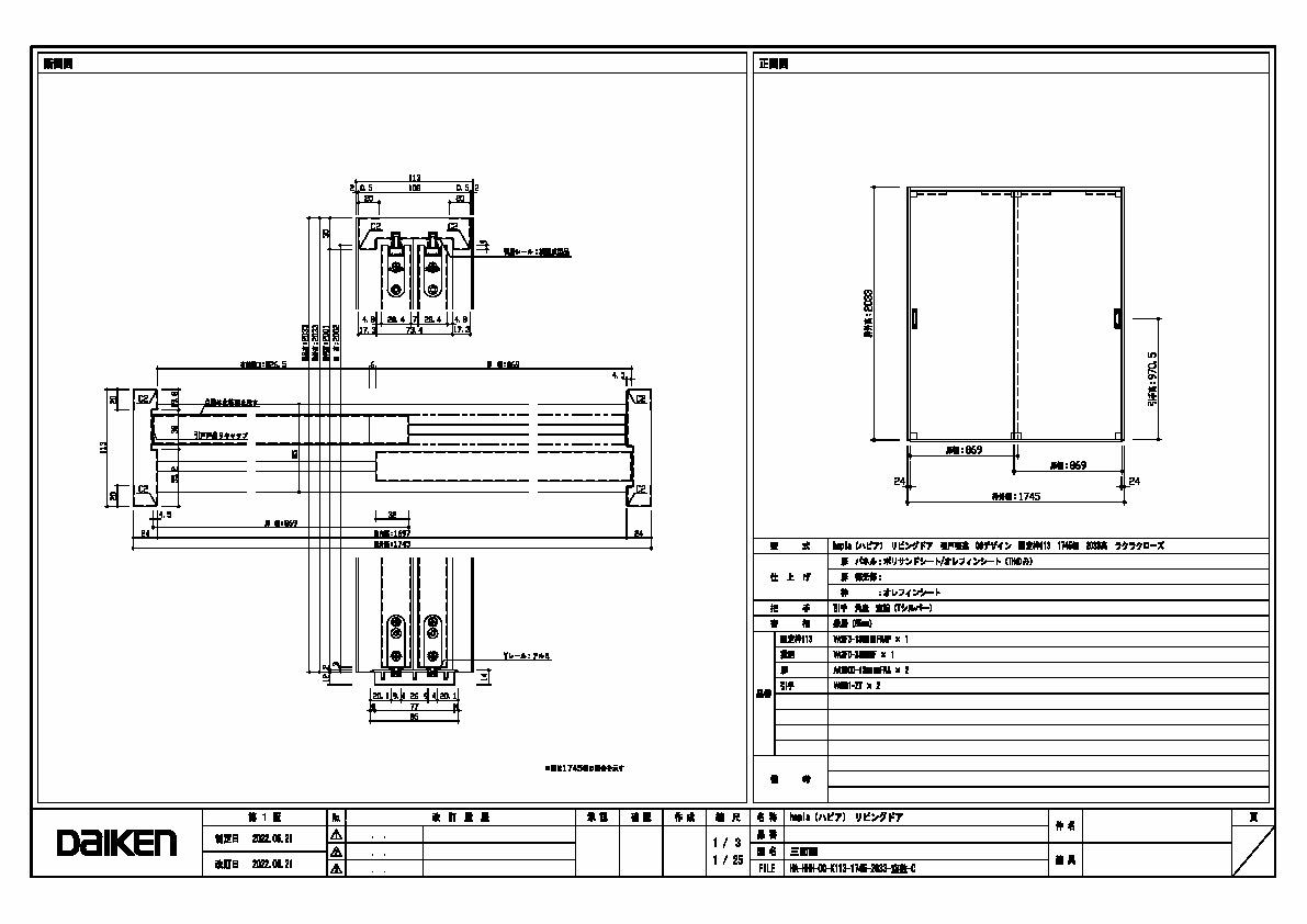 | キャプション | 1745幅 2033高 引手 角座 空錠 敷居(85mm) 三面図 |